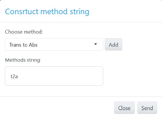 In the "Choose method" list, select the desired processing method. The "Add" button adds the method to the preprocessing sequence described in the "Methods string". When the processing sequence is formed, click the "Send" button to transfer it to the main program. The "Close" button closes the constructor window without transferring the preprocessing sequence.