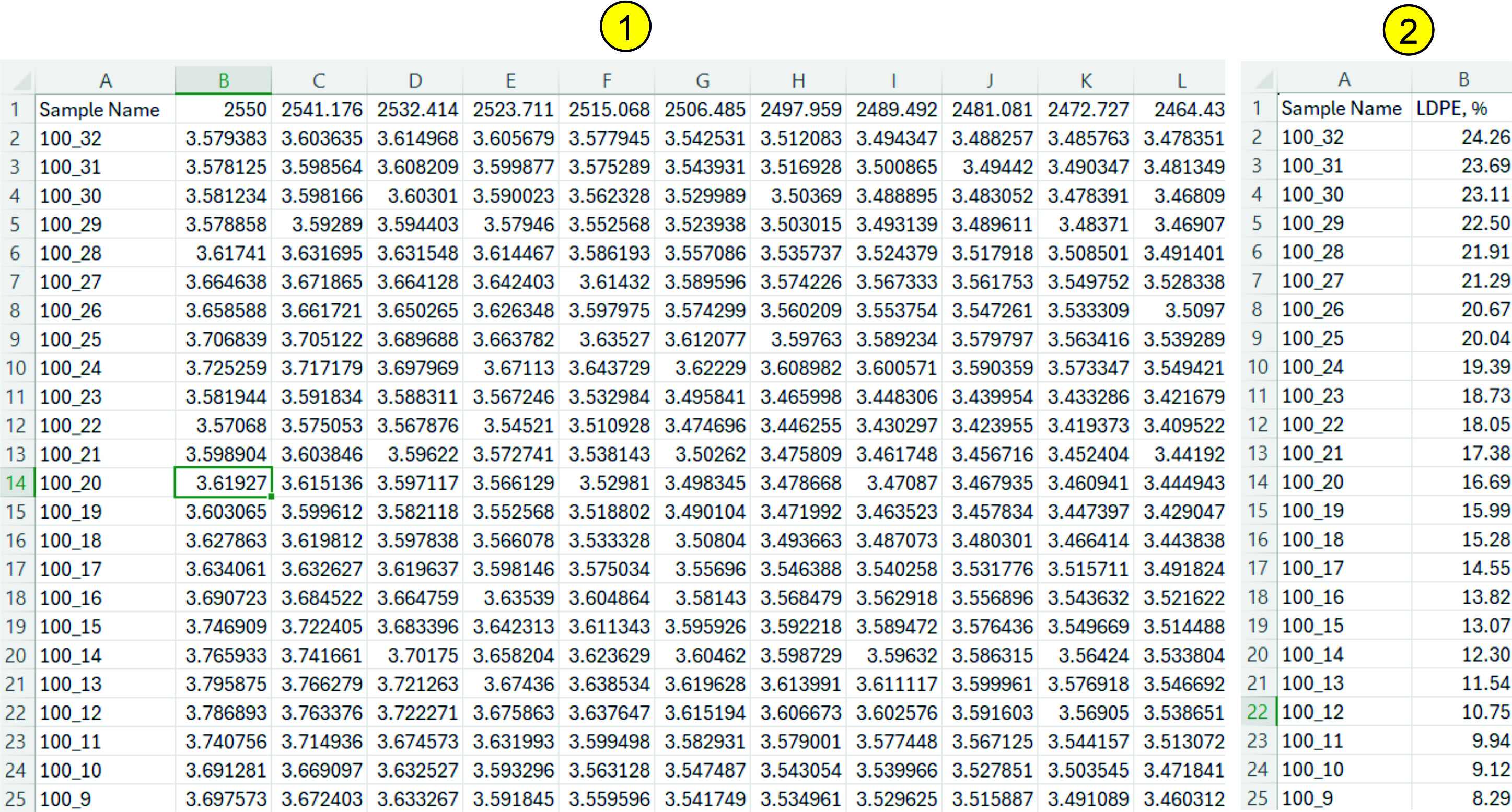 All spectra are downloaded as a *.csv file (square matrix). The first column of the file should contain sample names or numbers; the first row should contain the wavelength. An example of such a spectrum is shown in the following figure (1). If the spectrum matrix contains empty cells, cells with non-numeric values, various artifacts, then such a spectrum will either not be downloaded (you will receive an error message during download) or various errors will occur during processing of such a spectrum. The spectrum matrix should contain from one record to 10,000. If the number of records (samples) is significant (a thousand or more), then the processing speed slows down and the results of processing, searching, modeling should be expected for some time (up to several minutes). Data vectors (Y-block, response vector, reference values) should also be uploaded as a *.csv file. Currently, the Service supports only data vectors, i.e. one spectrum corresponds to one reference value. The appearance of such a file is shown in the following figure (2):