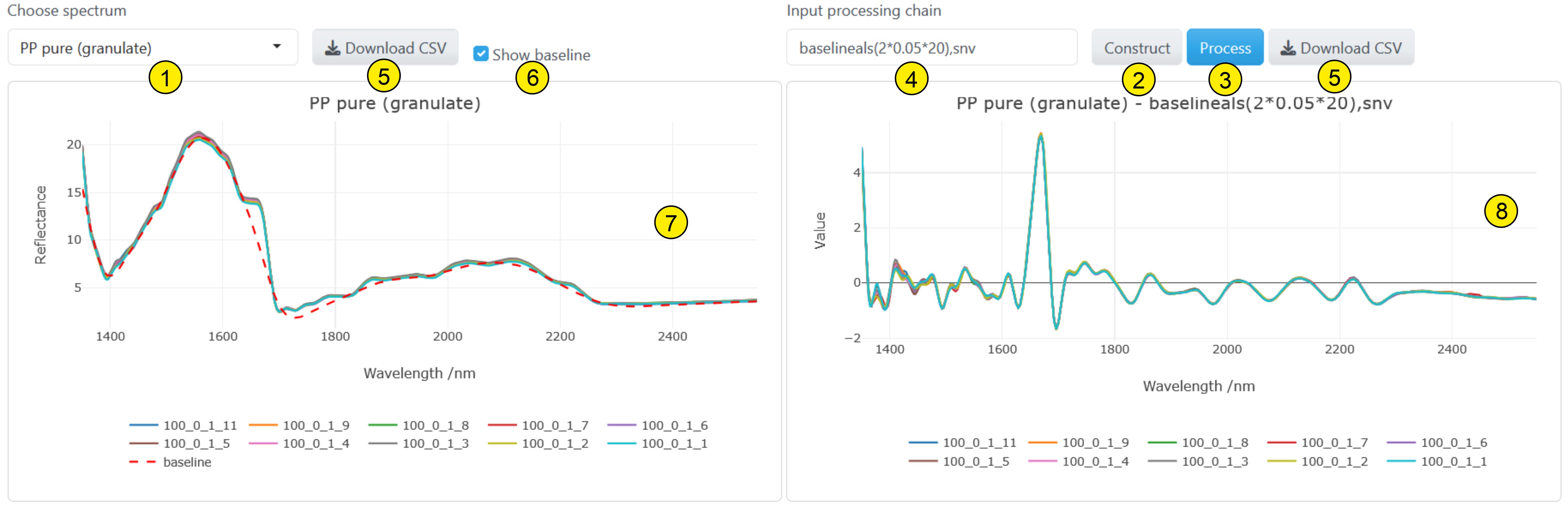 Pre-processing spectraTo pre-process spectra, use the "Spectra Visualizer" page. Page view with processed spectrum: