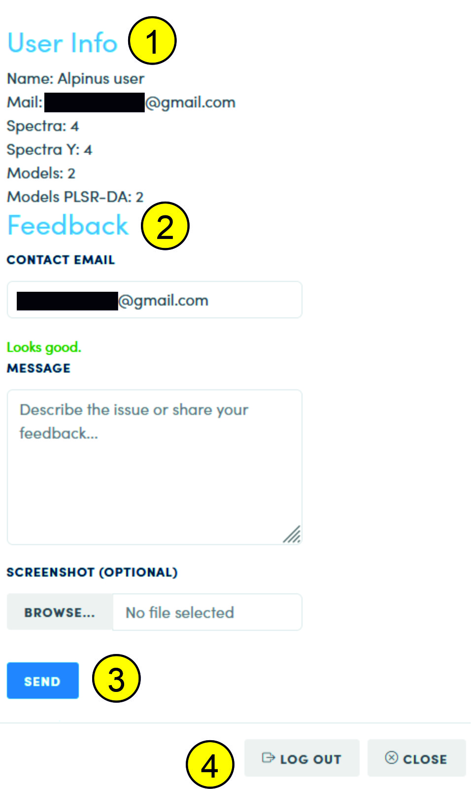 If you click the authorization button again after authorization, you will get access to general information about your spectra (1), to the feedback form (2), which contains fields for: