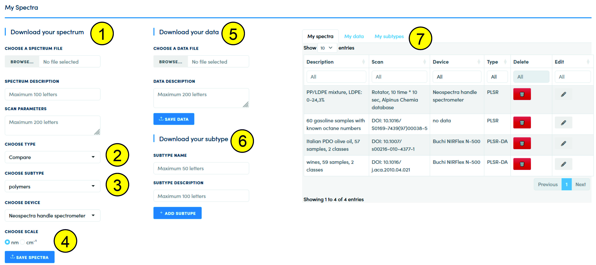 When loading a spectrum (1), it is possible not only to select a file with data in *.csv format, but also to enter information about the spectrum (Spectrum Description) and information about the scan mode (Scan Parameters). This information will be saved in the database and linked to the data set. The choice of data type (2) affects the interface - if "Compare" is selected, then to load the spectrum you need to add a subtype (3). For PLSR, PLSR-DA models, the subtype is not selected. If there is information about which device was used to obtain the spectrum, then it can be selected in the list of devices (Choose Device). If there is no such information, then you can select the "no data" option. If the required device is not in the list, then you should contact the administrator with a request to add this device to the list. By default, all data in the database is stored on the "nm" scale. If the scale in the file has the "cm-1" format, then this format must be specified (4). When loading the file, the conversion to nanometers will occur.